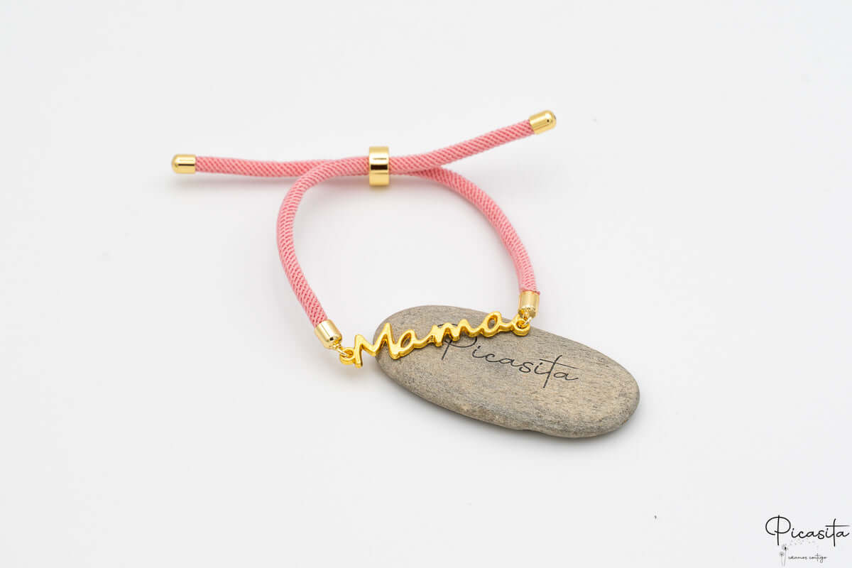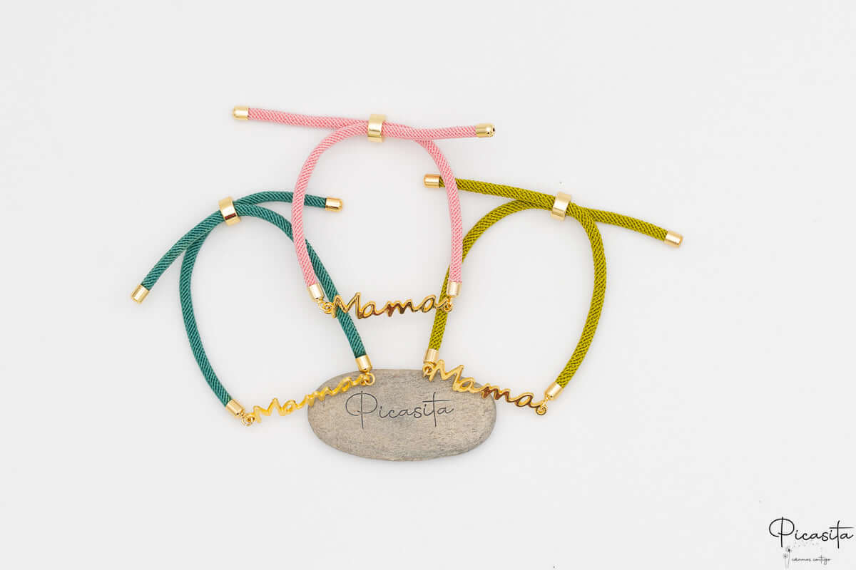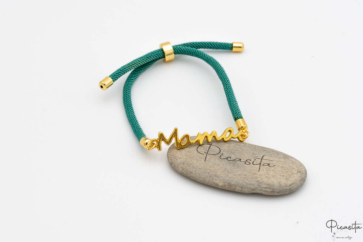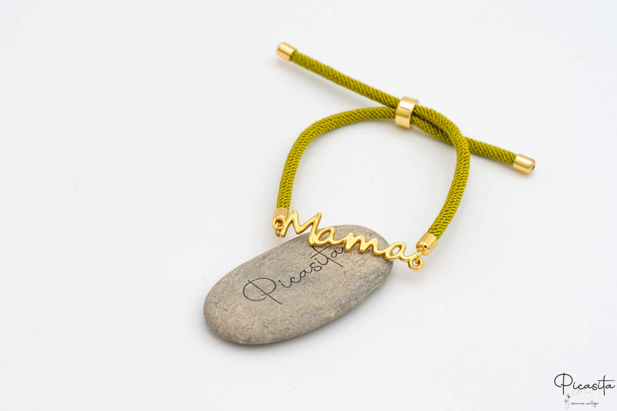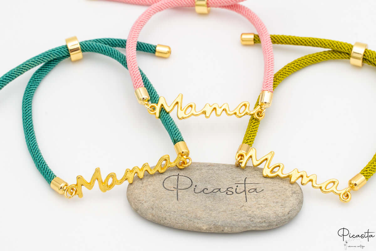 • Design: Schnurarmband mit dem Wort „Mama“ aus goldenem Metall.