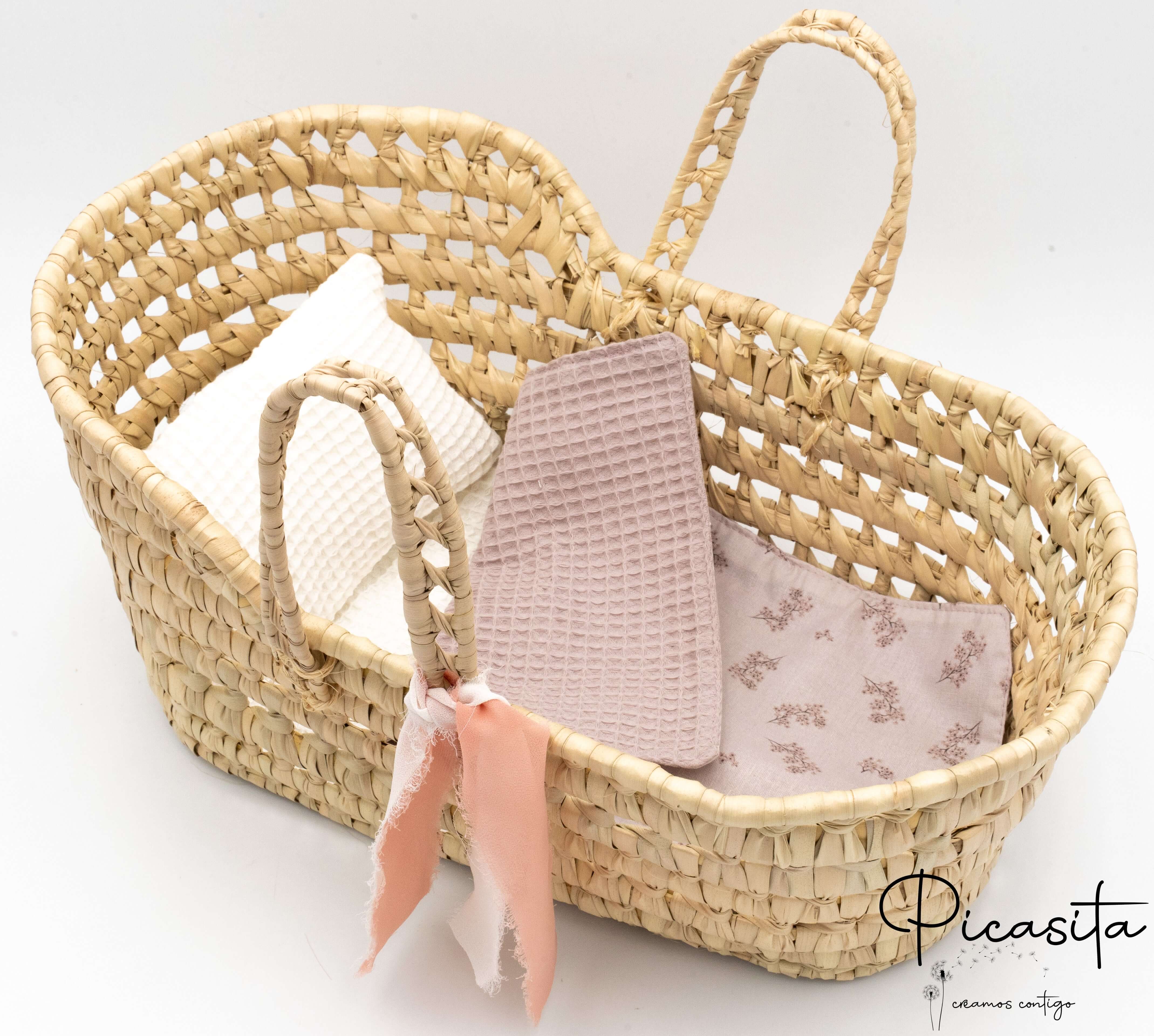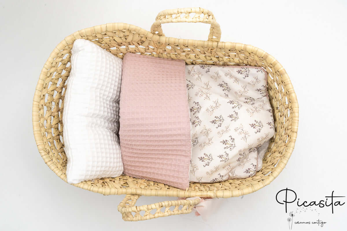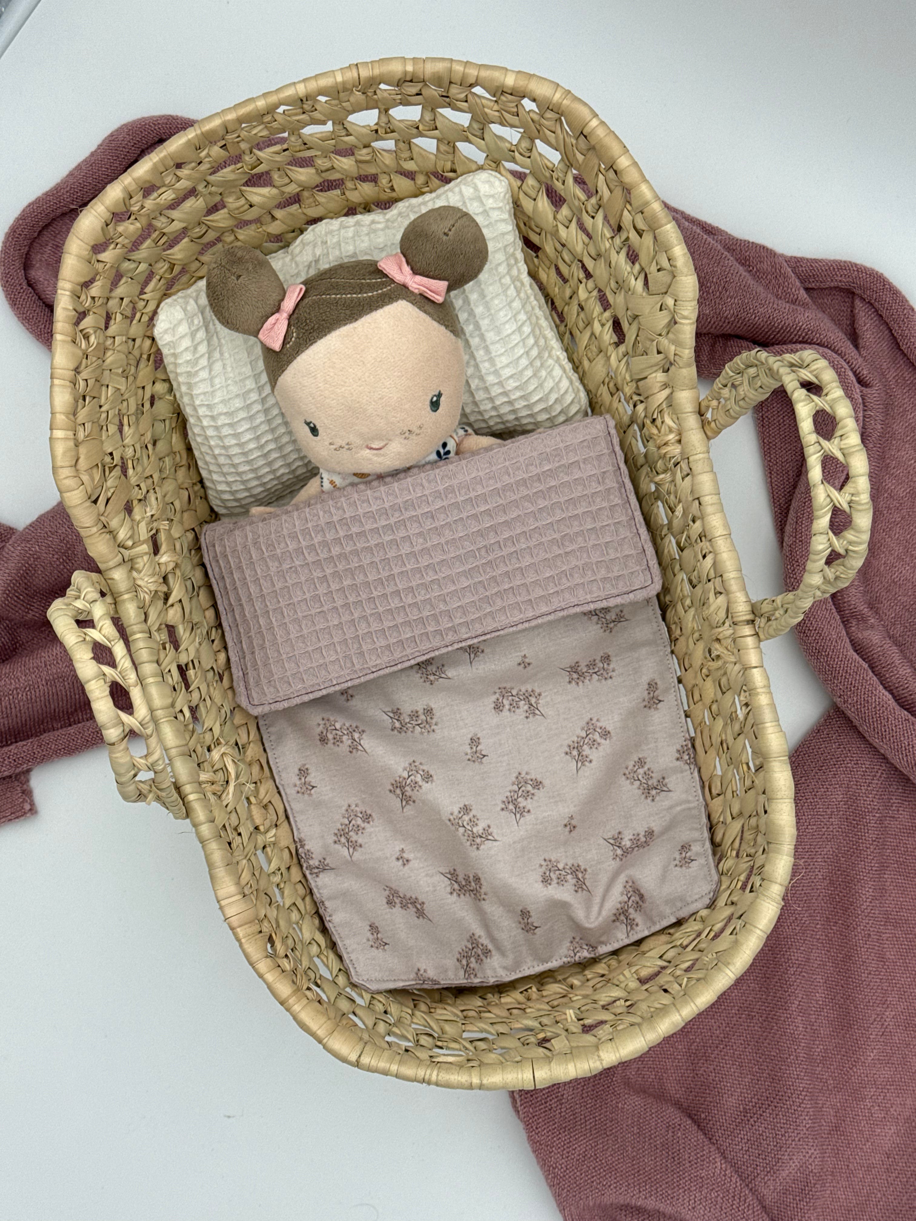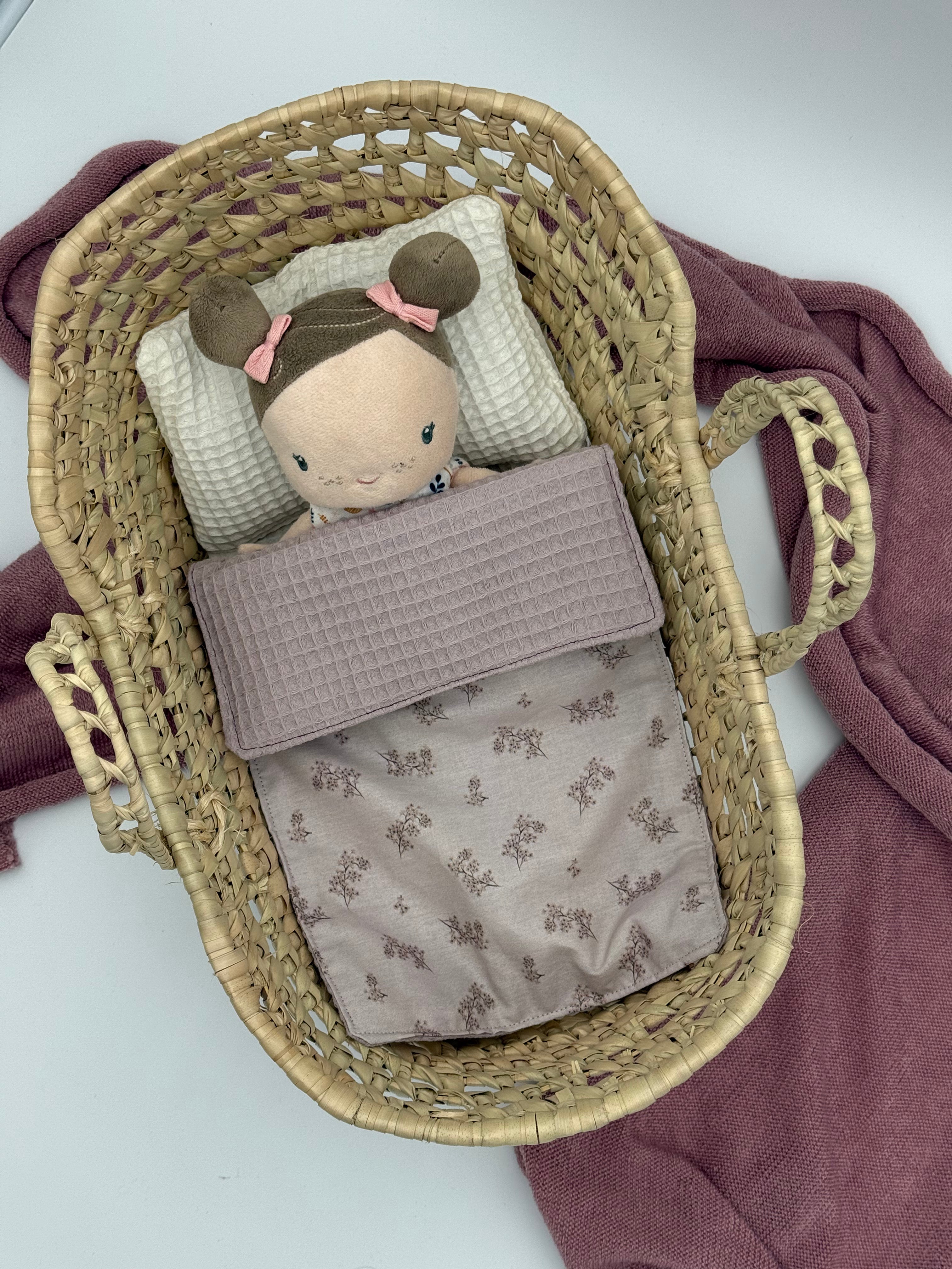 Was unser handgefertigtes Moseskörbchen wirklich zum Strahlen bringt, ist seine Bettwäsche. Wir fertigen jedes Set vollständig handgearbeitet in unserer Werkstatt an. Das Set beinhaltet ein weiches Kissen aus weißem Waffelstoff und einen Schlafsack mit einem zarten Blumenmuster in Malvenfarben. Wenn Sie sich für dieses Puppenkörbchen entscheiden, setzen Sie auf ein langlebiges Produkt, das den Rhythmus der Kindheit respektiert und ein kreatives Spiel voller Zärtlichkeit und unvergesslicher Erinnerungen fördert.