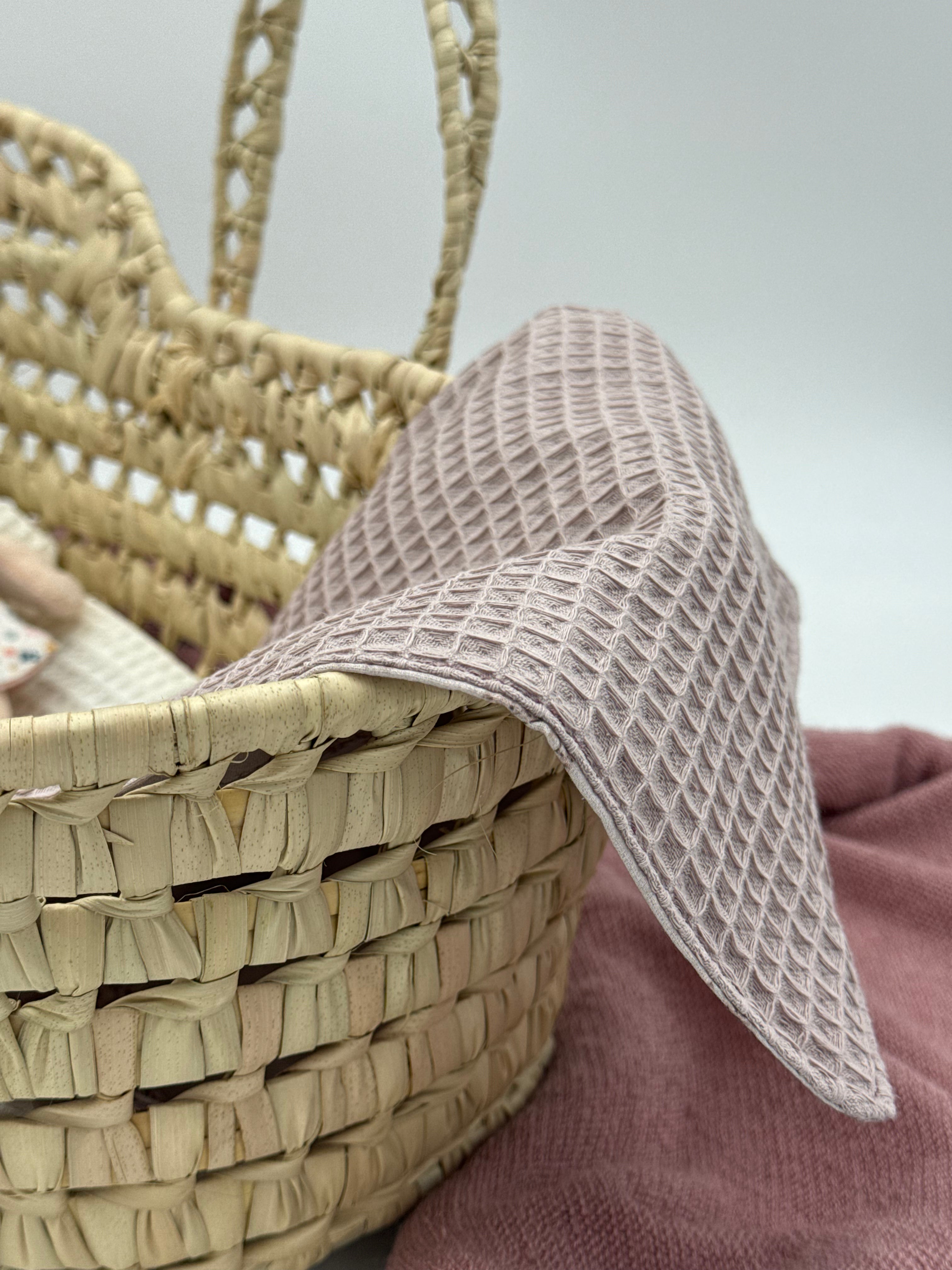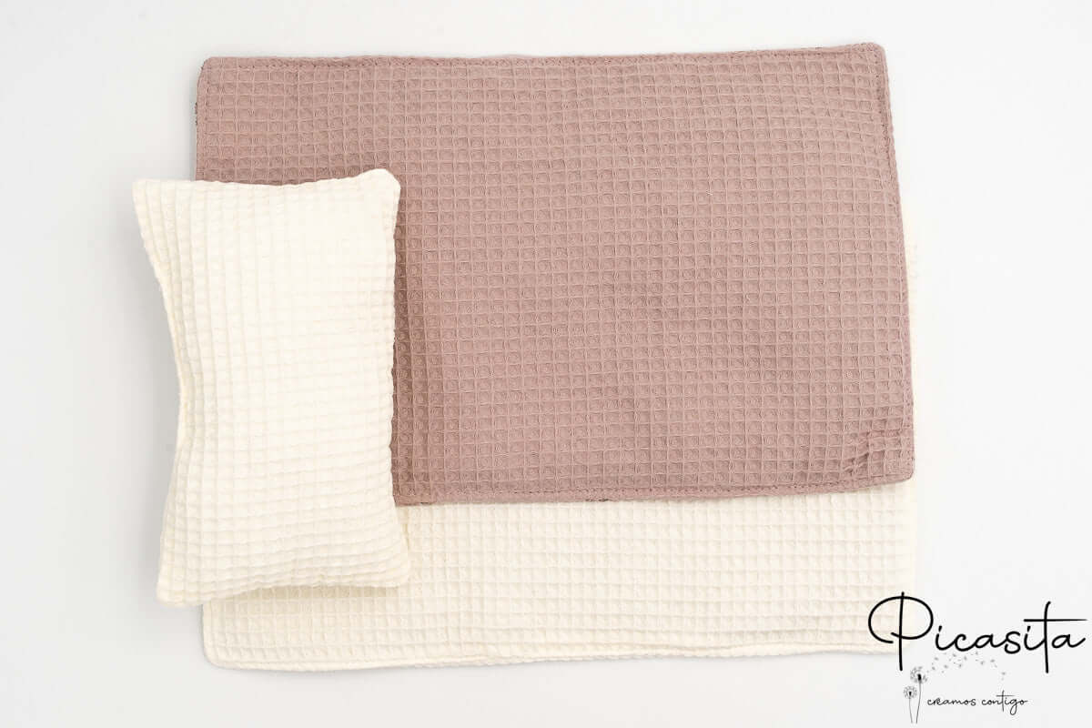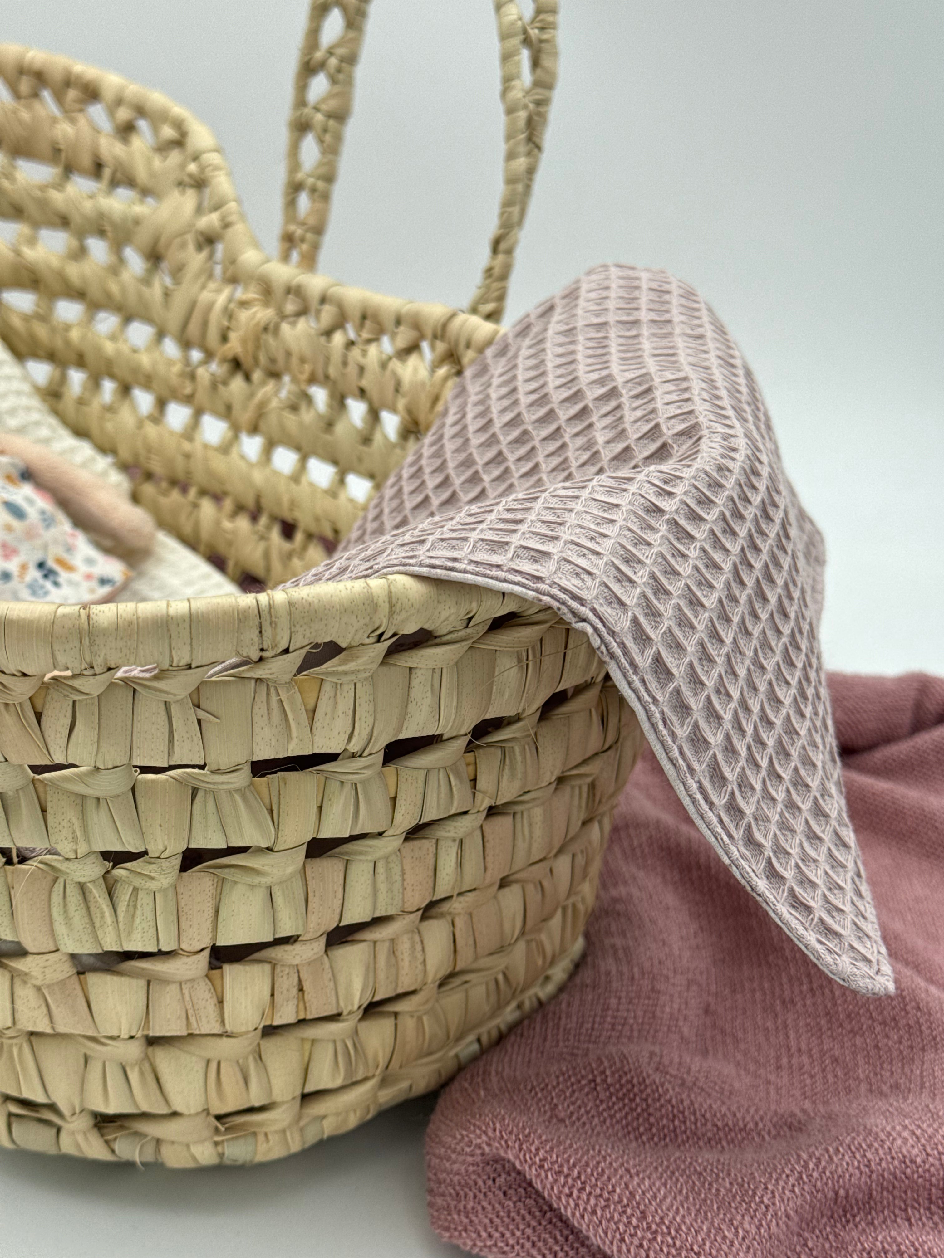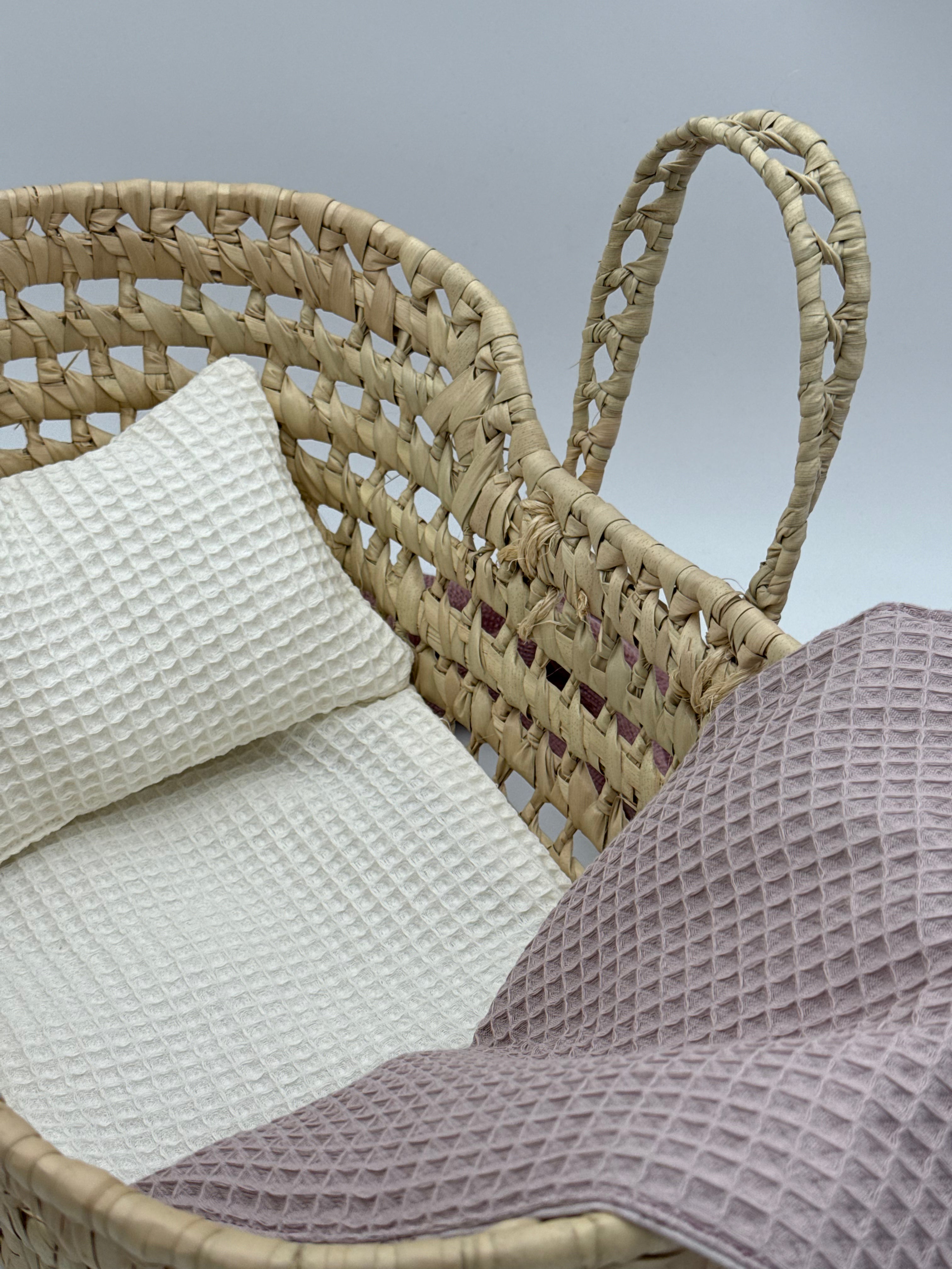 Was unser handgefertigtes Moseskörbchen wirklich zum Strahlen bringt, ist seine Bettwäsche. Wir fertigen jedes Set vollständig handgearbeitet in unserer Werkstatt an. Das Set beinhaltet ein weiches Kissen aus weißem Waffelstoff und einen Schlafsack mit einem zarten Blumenmuster in Malvenfarben. Wenn Sie sich für dieses Puppenkörbchen entscheiden, setzen Sie auf ein langlebiges Produkt, das den Rhythmus der Kindheit respektiert und ein kreatives Spiel voller Zärtlichkeit und unvergesslicher Erinnerungen fördert.