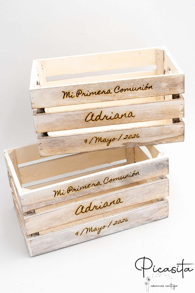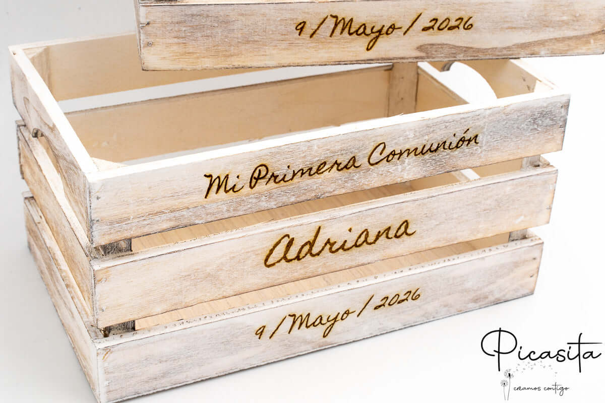 Die Süße der Kindheit und Familienfeiern verdienen es, mit edlen Materialien eingerahmt zu werden. Deshalb haben wir dieses Design als perfekte rustikale Kiste für Kommunion-Geschenke entworfen. Mit ihren vielseitigen Maßen (von der kleinen Kiefer 22x15x10 cm bis zur großen weißen 26x16x13 cm) und den praktischen seitlichen Griffen ist sie äußerst bequem, um Andenken an die Familie zu verteilen. Jede Holzkiste fügt sich dekorativ ein und verleiht dem Raum einen ästhetischen Mehrwert, der ihn mit Licht und Freude erfüllt.