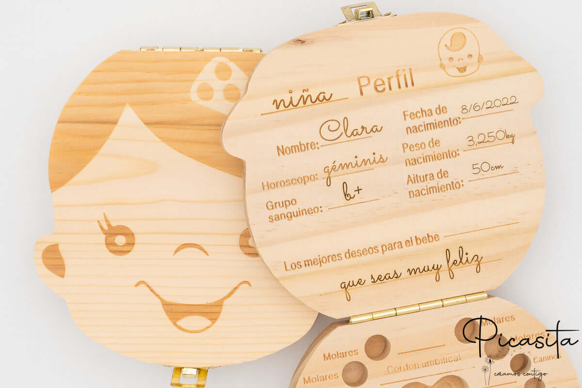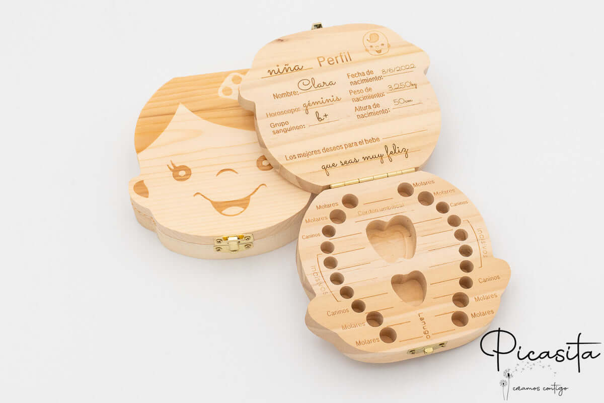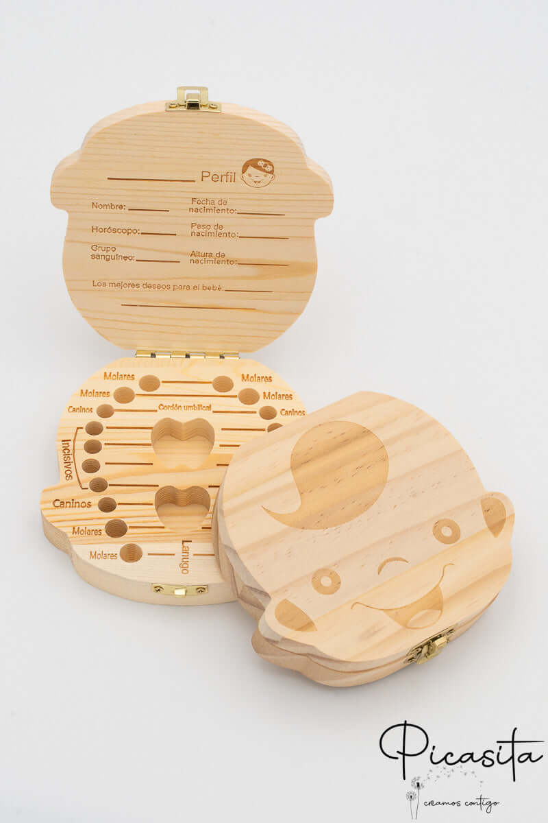Hergestellt aus natürlichem Kiefernholz von hoher Widerstandsfähigkeit, hat dieses Archivierungswerkzeug die Maße 12,5 cm Länge, 11,0 cm Breite und 2,8 cm Höhe. Jede Milchzahndose verfügt über einen Sicherheitsverschluss aus Metall in Bronzeoptik, der garantiert, dass das Studienmaterial während des gesamten akademischen Zyklus geschützt bleibt. Sie können zwischen dem Außen-Gravurdesign Junge oder Mädchen wählen, je nach Inspirationsquelle des Studenten.